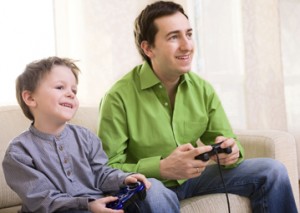 Father and son with video game controllers